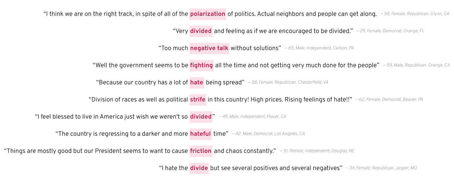 Even with all the stress Americans carry in their daily lives around money, family, and health, it is politics and polarization that most often show up when people explain why they are dissatisfied with the direction of the country. Americans describe polarization as something that shows up in their relationships, their media consumption, and their sense of safety.