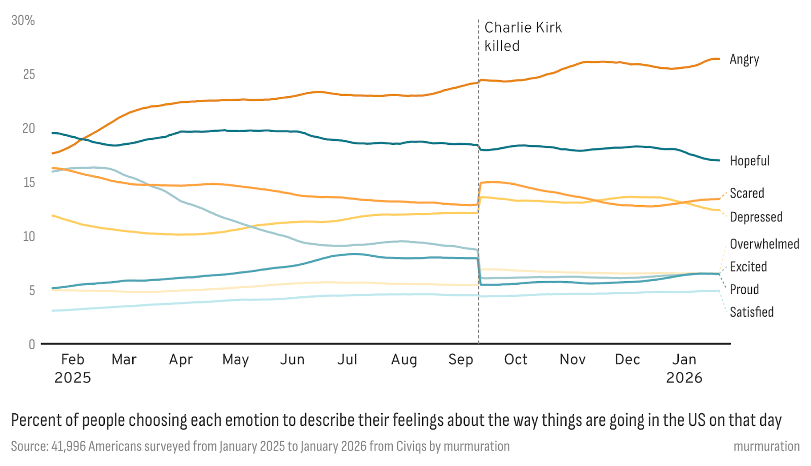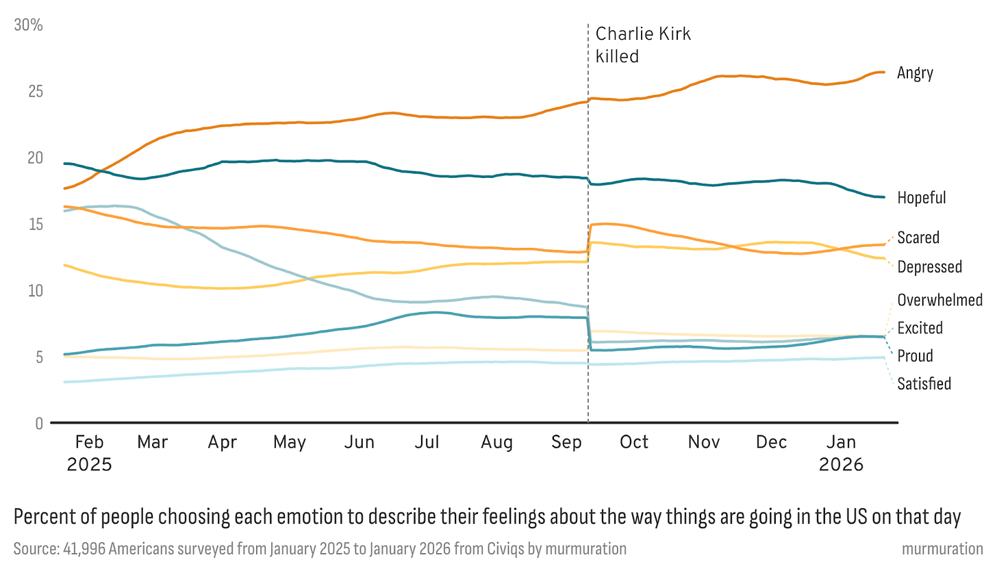 The single largest shift in Americans’ mood came in September, following the assassination of Charlie Kirk. Republicans responded with a surge in anger and a noticeable drop in the share saying they felt proud or excited about the direction of the country. Independents and Democrats, by contrast, were more likely to describe feeling scared, overwhelmed, or depressed. Across groups, the violence registered less as a partisan moment and more as a signal that political conflict in the country had crossed a line.