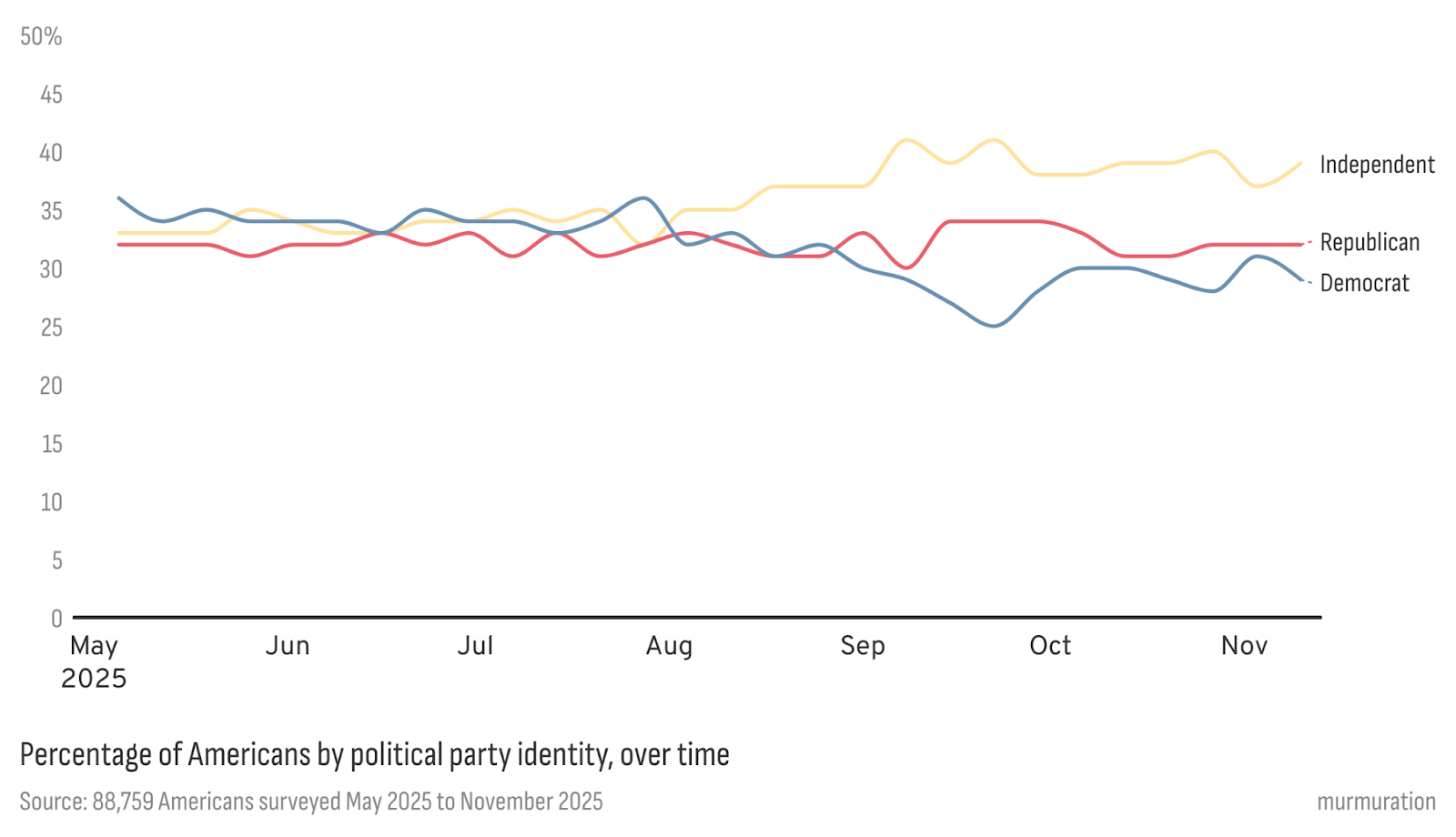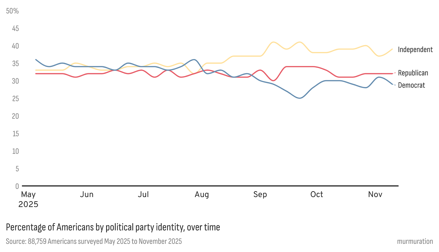 We also see a real reshaping of partisan identity, not between the two major parties but away from them. Democratic identification has slipped several points since the spring (36% to 29%); Republican identification has stayed roughly stable (32%); and the share of people calling themselves Independent has grown from about a third (33%) to nearly two in five (39%).