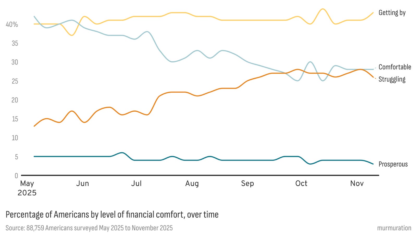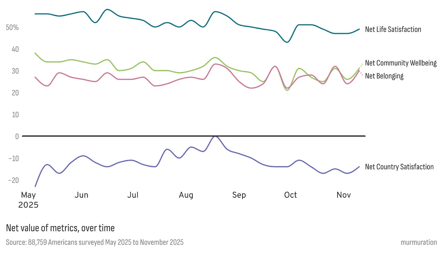 At the same time, people’s financial comfort has worsened significantly. This is the clearest trend in the entire dataset. In May, 53% said they were struggling or just getting by; by late September, that share had jumped to 71% where it is still hovering. The share of people who feel financially comfortable or prosperous has marched downward in mirror image. It’s a movement you can feel in everyday life through rent renewals, grocery bills, debt payments, jobs not keeping up, etc. The subjective economy has cooled even as life satisfaction as a whole barely moves, which is an interesting psychological divergence in itself.