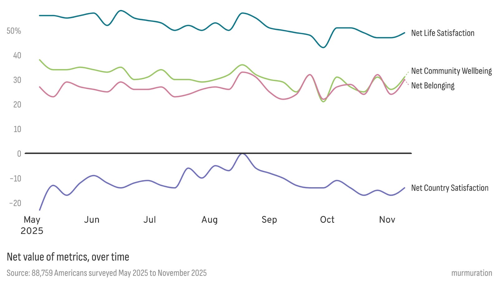 When we started Civic Pulse about a year ago, we wanted to do more than take a snapshot. We wanted a pulse—something alive, continuous, and capable of telling us how the mood of the country shifts beneath the surface noise of headlines. Month after month, we’ve asked a set of “tracking” questions: how satisfied people are with their lives, how hopeful they feel about the future, how much stress they’re under, whether they feel they belong to a community that cares about them and a few more. The answers across the last six months paint a picture of a nation both steady and strained.