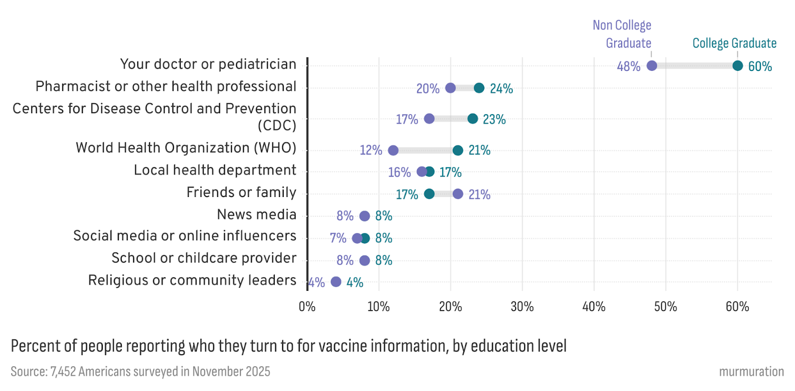 When it comes to guidance on something as basic as childhood vaccines, people scatter across a wide range of sources. Doctors are still the anchor, with 52% turning to their pediatrician or primary care provider. Pharmacists come next at 21%. Friends and family follow at 20%. Institutional public health sources like the CDC, WHO, or local health departments draw only 15–19%. And 7% turn to social media or influencers. The sharpest contrast appears once you break the data out by education level a clear shift in how much weight people place on expert opinions.