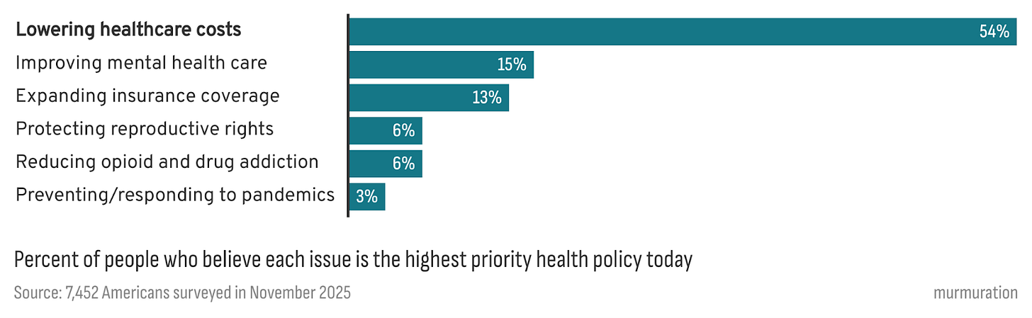 So it tracks that when we asked people which health policy issue should be the nation’s top priority, 54% chose lowering healthcare costs. Nothing else came close. Not mental health, not insurance expansion, not reproductive rights, not opioids, not pandemic preparedness. Cost dominates everything.