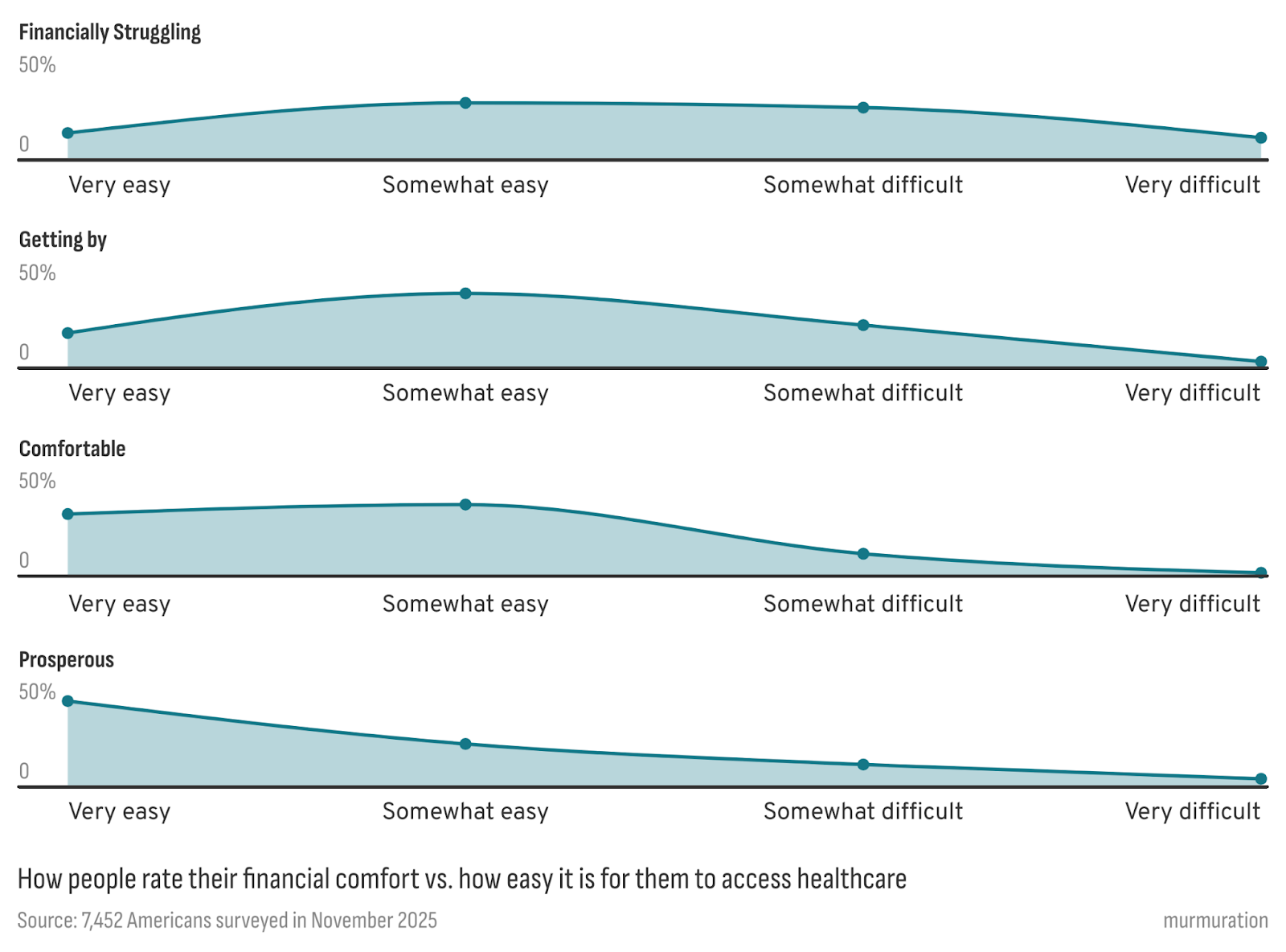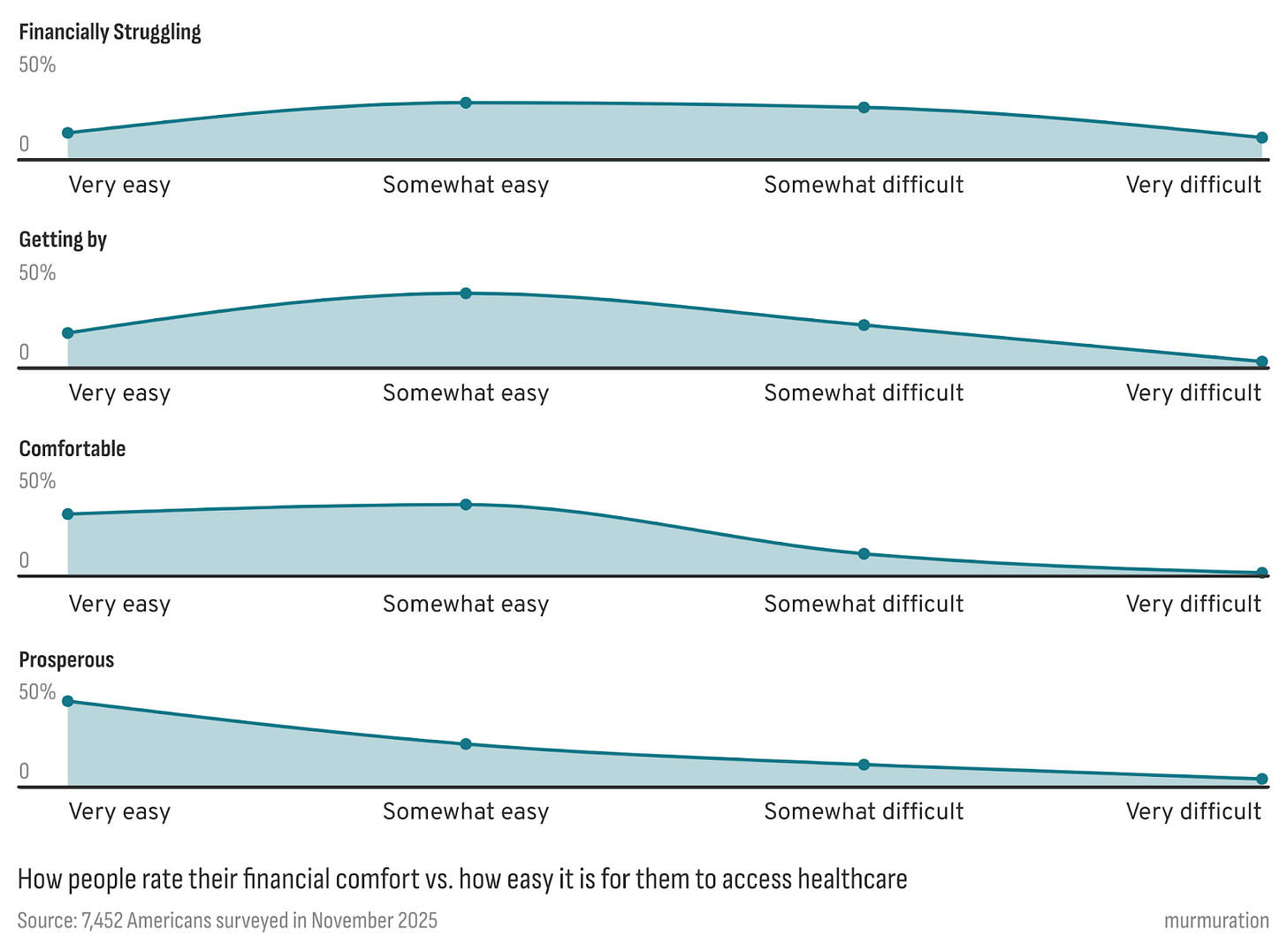 But people’s lived experiences tell a different story. Even those in good health talk about uncertainty: long waits for appointments, rushed visits, opaque billing, and the sense that the quality of care depends too much on luck and geography. Beneath it all is a steady worry that the system won’t be there when they truly need it. And more than anything, they talk about cost. That tension comes into sharp focus when we look at access by financial comfort.