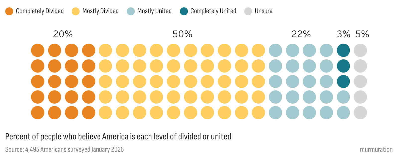 That sense of division is not abstract. Nearly seven in ten Americans describe the country today as either completely or mostly divided, with only about one in four seeing the nation as mostly united.