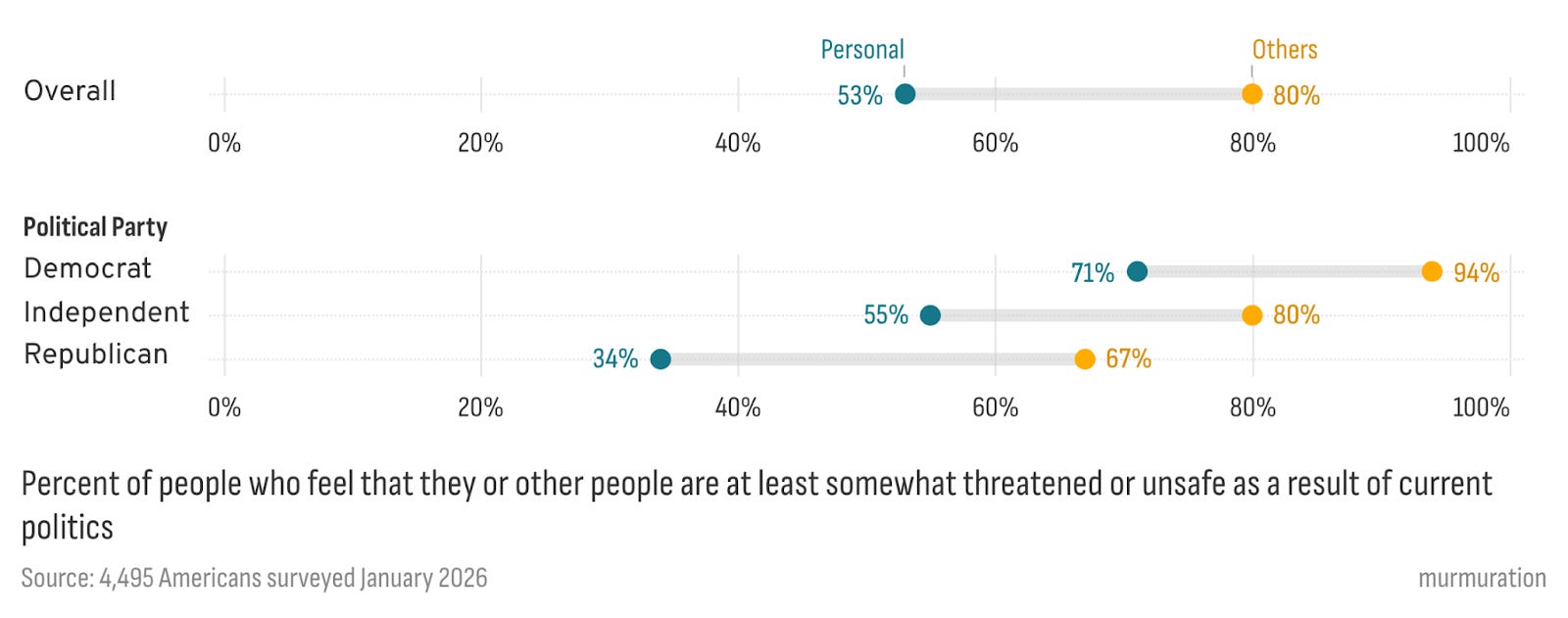 Even more unsettling, Americans (80%) are very concerned that other people may be threatened or unsafe due to current politics. The gap here is telling. Americans demonstrating care for others are far more likely to perceive danger facing their fellow citizens than to describe themselves as directly unsafe. Even those who feel relatively secure are alert to the broader political atmosphere and attentive to what others may be experiencing.