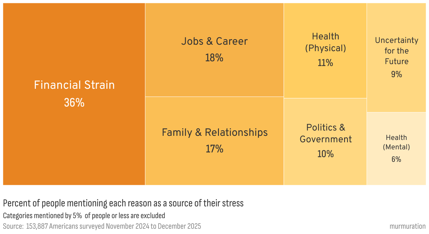 Across every month, certain stressors never drop out of view: financial strain, work pressure, family responsibilities, and health concerns. But one of the advantages of asking people, in their own words, what’s stressing them is that it also lets us see how stress moves with the world.