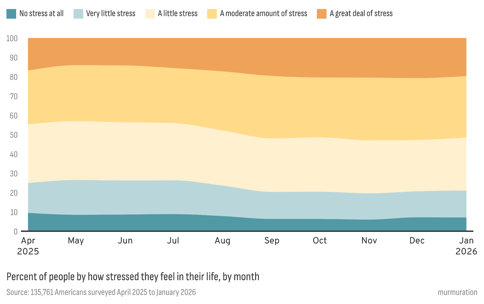 Last spring, we published an initial snapshot of Americans’ stress, trying to name the “weight we’re carrying” behind closed doors while still showing up to work, school, family dinners, and community life. The goal at the time was simple: make the private texture of stress visible, and create a baseline we could return to.
