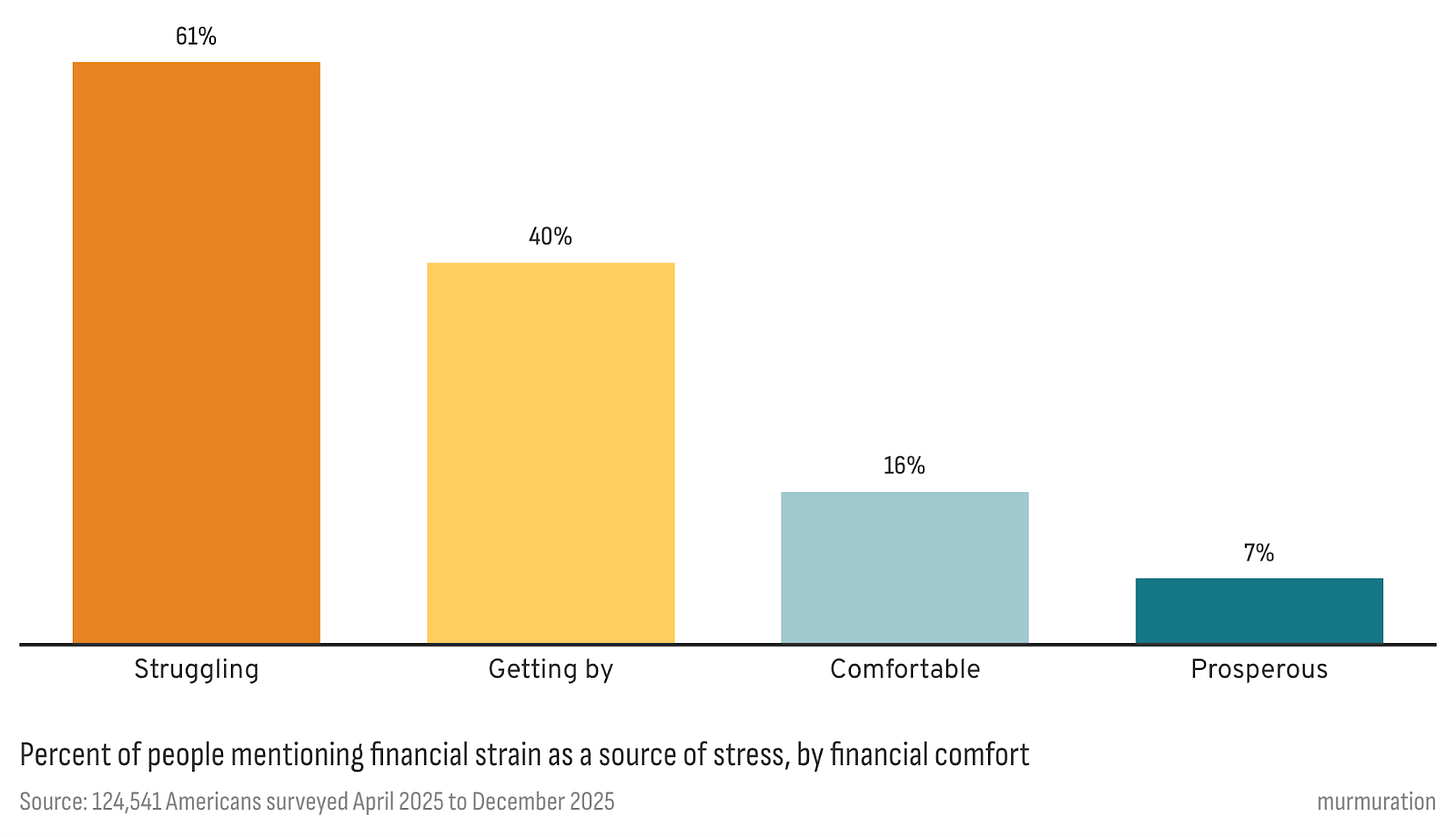 Among those who describe their level of financial comfort as struggling, 61% say financial strain is a source of stress. For those getting by, that figure drops to 40%. Among people who describe themselves as comfortable, it falls to 16%, and among the prosperous, just 7%.